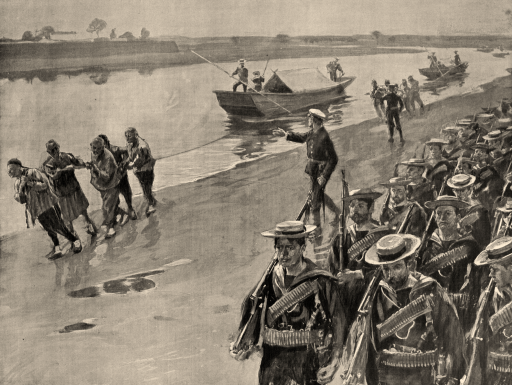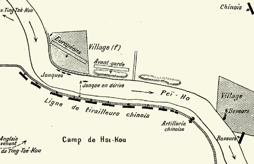 La progression est plus lente encore qu’en train. Le remorquage des jonques est éreintant, et les embarcations s’échouent régulièrement. On entend tout proche le bruit des combats : comme à Pékin, les concessions européennes de Tien-Tsin sont attaquées. En arrière, à deux kilomètres, une lueur se fait jour : les Chinois ont incendié les trains.