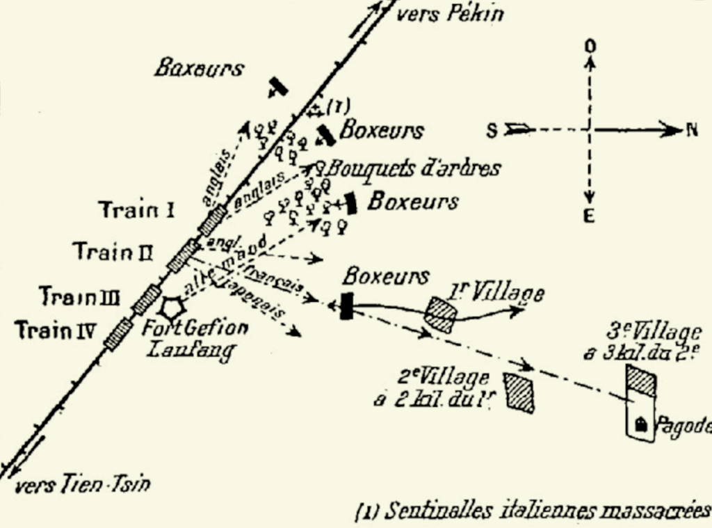 La progression est particulièrement lente. Le trajet qui ne devait, pensait-on, ne durer que deux jours, va prendre plusieurs semaines, entre ravitaillements, réparations des voies, et alertes sur la présence de Boxeurs à proximité. Le 14 juin, le convoi est pris en embuscade au cours d’un arrêt au franchissement du fort de Lanfang, à mi-chemin vers Pékin. Des sentinelles italiennes envoyées sur l’avant sont massacrées, et les trains attaqués. Tandis que les Anglais ripostent au Nord, et que les Allemands occupent le fort, les marins français sont débarqués et prennent d’assaut les villages et une pagode fortifiée d’où proviennent d’autres Boxeurs à l’Est. L’aspirant Golay manque de peu d’être blessé par un coup de lance qui lui est porté mais passant à côté. Seuls deux marins sont légèrement blessés. C’est le baptême du feu pour le quartier-maître Corentin Postic. Le détachement rapporte ses premiers trophées, lances enrubannées et fusils chinois. On enterre les sentinelles italiennes, sans aucune croix et en camouflant les sépultures, afin d’éviter qu’elles ne soient profanées.