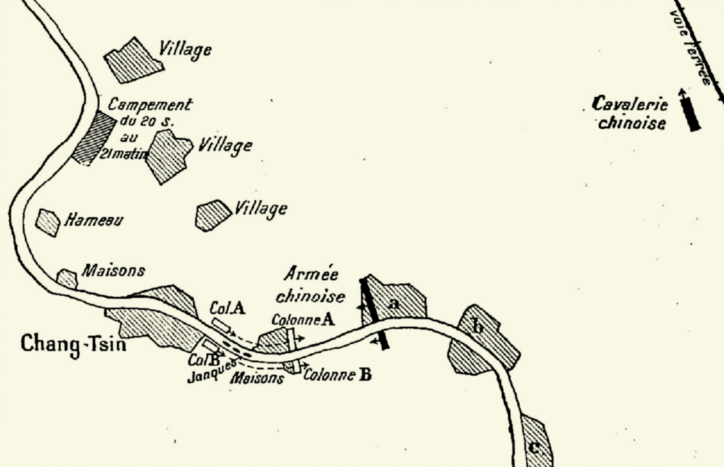 A près le franchissement du village de Chang-Tsin, les colonnes subissent une nouvelle attaque au canon. Les forces régulières chinoises barrent la route de Tien-Tsin. Il n’y a pas d’alternative pour la colonne qui doit franchir victorieusement cet obstacle. Le canon est de nouveau employé, puis le village est enlevé à la baïonnette.