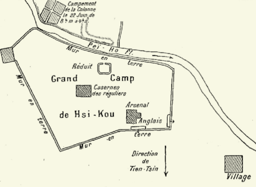 Le 21 juin, un conseil se tient pour décider de la marche à suivre. Depuis le débarquement du train le 19, la colonne n’a parcouru que la moitié du chemin qui la sépare de Tien-Tsin. On décide de progresser en deux colonnes, une sur chaque rive, encadrant les jonques et se couvrant mutuellement. Les Français et leur canon forment l’avant-garde de la colonne progressant sur la rive gauche.