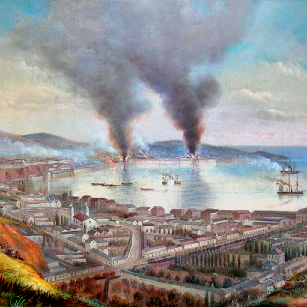 En couverture : Valparaiso pendant le bombardement de l’amiral Méndez Núñez, tableau de William Gibbons (1840-1886).