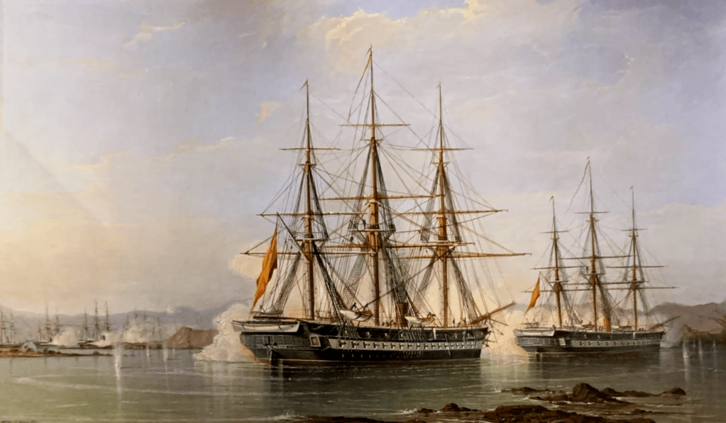 Le Samedi Saint, 31 mars à 7 heures du matin, les frégates Numancia, Resolucion, Villa de Madrid, et la corvette Vencedora, quittent leur mouillage situé à 2 milles environ au nord de la pointe Gruesa. La Berenguela, les transports, navires frétés et prises restent au mouillage. Les bâtiments font à très petite vitesse le tour de la baie, et à 8h10 la Numancia tire deux coups de canon à blanc. C’est le signal du bombardement.