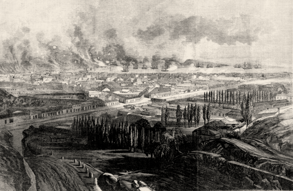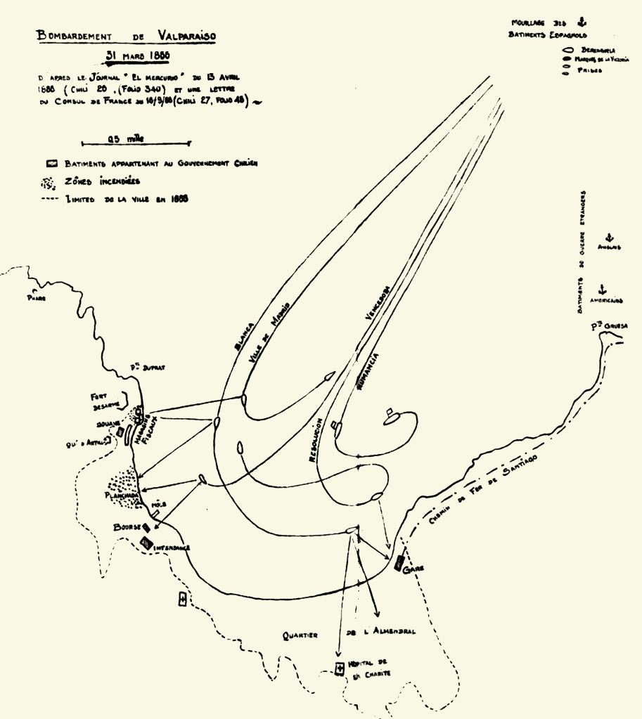 Valparaiso, ville de 70 000 habitants, constitue en 1866 le plus grand entrepôt du commerce européen sur la côte du Pacifique. Presque tous les magasins et toutes les habitations privées y sont propriétés européennes. Seuls appartiennent au gouvernement chilien : la gare, la bourse, la douane et les magasins fiscaux (qui contiennent les marchandises non dédouanées, appartenant encore aux commerçants européens). L’amiral Pareja, au début du blocus, a déclaré qu’il respecterait le droit des neutres ou que tout au moins il leur laisserait un long délai pour mettre leurs marchandises à l’abri d’un bombardement. Aussi les commerçants, très inquiets en septembre 1865, se sont rassurés et sont persuadés que si les Chiliens ne commettent pas d’acte provocateur contre l’escadre espagnole, le bombardement sera évité.
