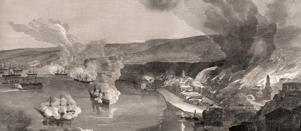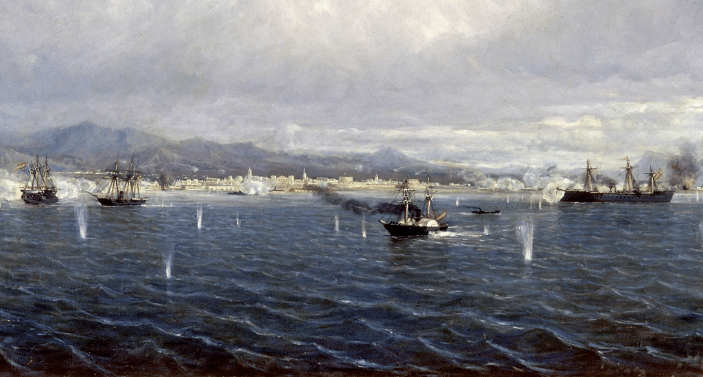 La Villa de Madrid, la Resolucion, la Blanca et la Vencedora mouillent et se répartissent les objectifs, comme l’indique le croquis donné en annexe. La Villa de Madrid et la Blanca tirent sur les magasins fiscaux, à la distance de 800 mètres environ, pendant que la Resolucion tire sur la gare, et la Vencedora sur l’Intendance et la Bourse. Mais la Vencedora et la Blanca envoient également des obus dans le quartier de la Planchada, ainsi nommé parce qu’entièrement construit en bois. A 10h45 il est en feu et l’incendie prend vite d’assez grandes proportions. Au milieu de la matinée, les bâtiments changent de mouillage. La Blanca dirige son feu sur le quartier de l’Almendral, où l’hôpital de la charité reçoit quatre obus. A 11h45, les magasins fiscaux, qui contiennent les marchandises européennes, sont complètement en feu. Par contre la douane, la Bourse, l’Intendance et la gare ont peu souffert. A 12h10, la Numancia, qui a croisé en rade sans prendre part au bombardement, hisse le signal « cessez le feu » et les bâtiments espagnols se retirent lentement vers leur mouillage, après avoir tiré 2600 projectiles de 68 et 32 livres, obus, boulets et projectiles incendiaires.