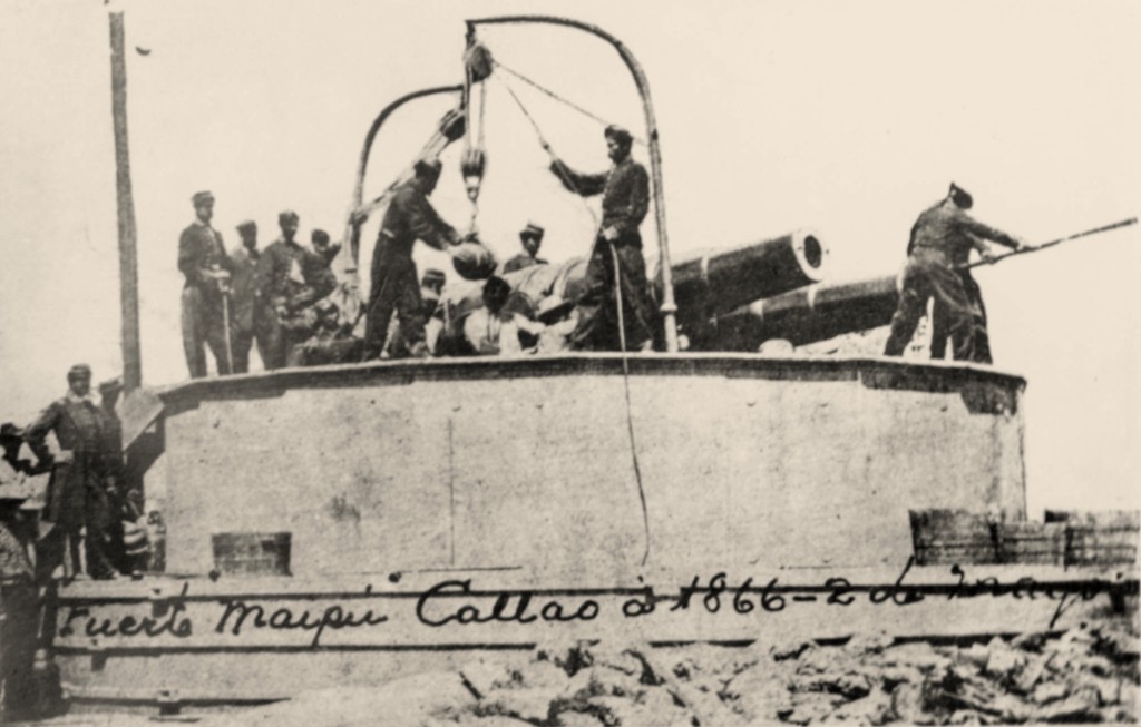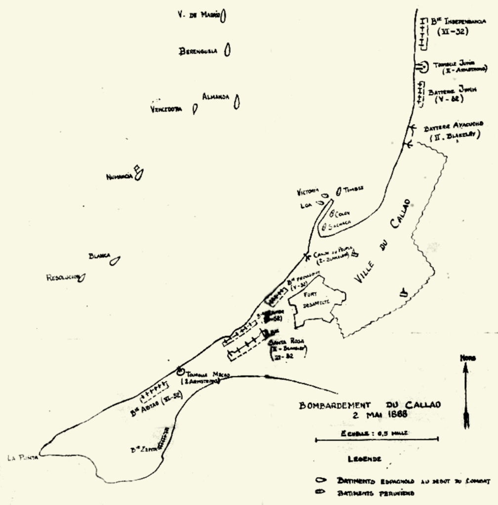 Dès qu’on a connaissance, au Callao, du bombardement de Valparaiso, on se prépare à défendre la ville. Le ministre de la guerre, don José Galvez, recrute du monde pour construire des parapets et monter les canons. A la fin du mois d’avril, la défense est assurée par les pièces suivantes : 4 canons rayés Armstrong en deux tourelles doubles, ce sont des pièces modernes de 300 livres (calibre 262mm), les tourelles sont cuirassées à 25cm de fer, les soutes sont bien protégées ; 5 canon rayés Blakeley de 550 livres (calibre 275mm) protégés seulement par des murs de briques ou de pierre, ou même simplement par des sacs de sable ; 39 vieux canons lisses de 32 livres (calibre 160mm environ) répartis en batteries médiocrement protégées. D’autre part sont mouillés dans le port le monitor Loa (deux canons lisses de 100), le monitor Victoria (un canon lisse de 100 en tourelle), l’aviso Tumbes (deux vieilles pièces de 32). Le reste de l’escadre péruvienne est toujours dans le Sud du Chili.