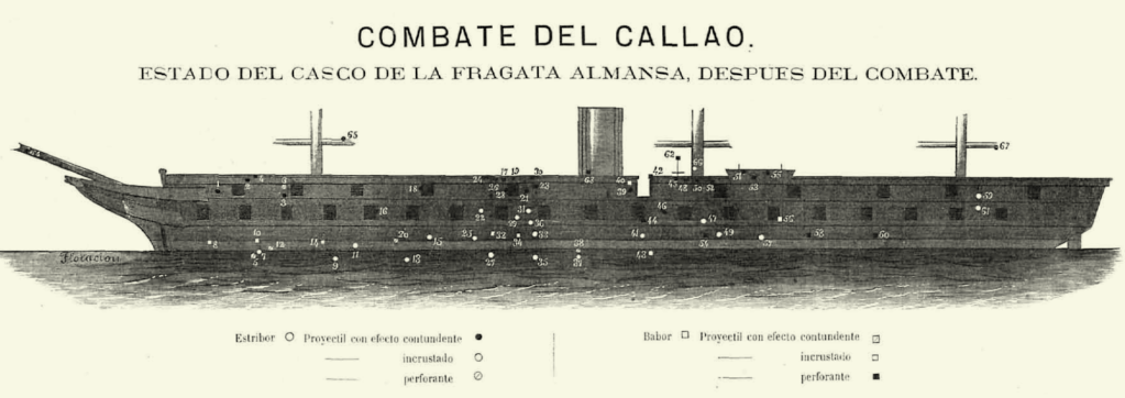 A 16h45 enfin, la Numancia et la Vencedora, ayant épuisé leurs munitions, se retirent définitivement, et l’escadre entière reprend son mouillage au nord de San Lorenzo. A ce moment, cinq seulement des pièces de la défense sont encore capables de tirer. Le rôle des bâtiments de guerre péruviens a été insignifiant. Au milieu de l’action, l’aviso Tumbes est sorti du port, mais atteint aussitôt par 4 projectiles qui lui tuent 7 hommes, est revenu mouiller auprès du môle. Le tir des monitors paraît avoir été peu efficace, par contre dix impacts ont été relevés sur le Loa, un sur la Victoria.
