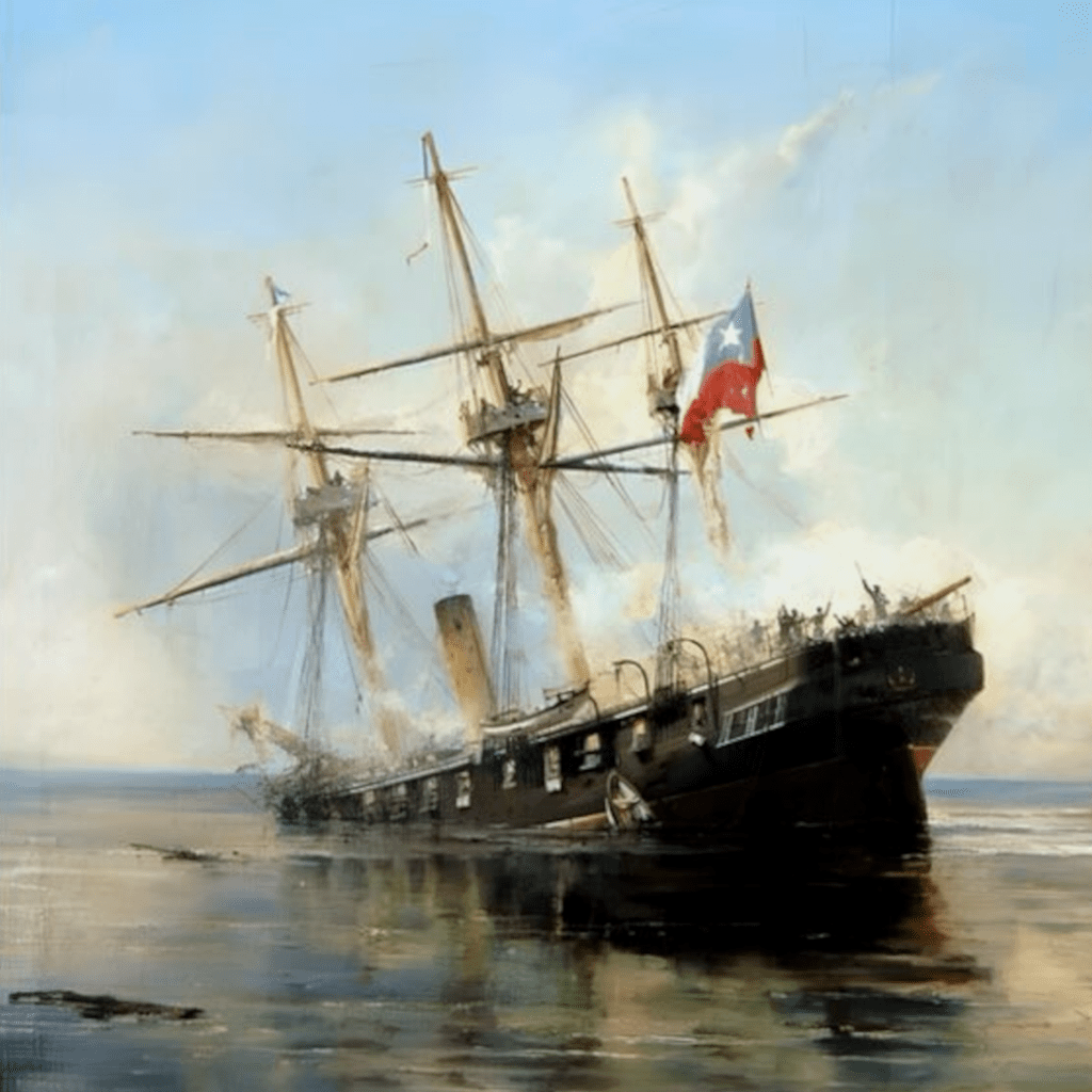 Dans la matinée du 21 mai, les marins chiliens qui bloquaient Iquique virent s’avancer deux puissants navires qu’ils reconnurent bientôt pour la frégate cuirassée Independencia et le monitor Huascar. Les vaisseaux chiliens étaient sous les ordres de don Arturo Prat, commandant de l’Esmeralda, et de don Carlos Condell, commandant de la Covadonga, tous deux jeunes, résolus et pénétrés de leurs devoirs. Sans se dissimuler les difficultés de la situation, ils réunirent les officiers de leur bord ; et là, en conseil de guerre, et en présence du puissant ennemi qui venait les attaquer, ils résolurent de combattre jusqu’à la mort et de vendre chèrement leur vie.