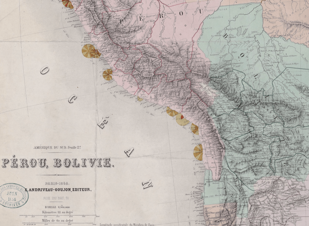 Le Pérou n’avait pas jusqu’alors pris une part ostensible dans cette question. Il y a des motifs de croire que, dès cette époque, il encourageait secrètement l’esprit intraitable de la Bolivie, mais en apparence il se présentait comme l’ami sincère du Chili. Néanmoins la marche des négociations, la modération avec laquelle le Chili cherchait un arrangement pacifique, même en sacrifiant les droits qu’il croyait parfaitement légitimes, poussèrent le gouvernement du Pérou à se départir de cette conduite, et à ne plus prendre pour guide que ses propres intérêts. En 1872, quand don Manuel Prado prit en main les rênes du gouvernement, le Pérou était à la veille de la banqueroute, les revenus produits par le guano commençaient à diminuer. Pour remplacer les ressources sur lesquelles ont avait compté, le gouvernement du Pérou chercha à s’emparer sous un prétexte quelconque des dépôts de salpêtre qui abondaient dans son territoire. Mais il se présentait une nouvelle difficulté : ces dépôts de salpêtre étaient exploités en grande partie par des bras et des capitaux chiliens. Plusieurs compagnies organisées à Santiago et à Valparaiso, et soutenues par les banques de ces places commerciales, avaient formé de vastes établissements pour l’exploitation du nitrate dans la province péruvienne de Tarapacá.