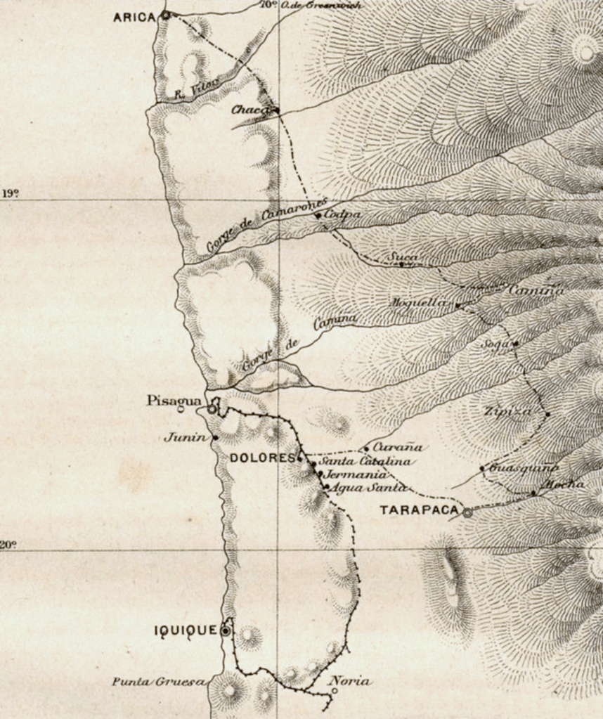 Depuis 1830, le Chili a offert un exemple unique dans l’Amérique espagnole, et très rare dans les autres pays du monde, celui de la succession légale et réglée de tous ses gouvernements. Depuis 1830, tous les chefs du pouvoir exécutif y sont arrivés en vertu de la loi, sans que jamais aucun n’ait été imposé par une révolution. Tenus ainsi éloignés des voies révolutionnaires et par l’influence de la loi et par l’action à la fois ferme et modérée du gouvernement, les Chiliens ont concentré toute leur activité sur un seul point : le développement de l’industrie. La conséquence de cet esprit d’initiative a été de quintupler la population qui atteint aujourd’hui (1881) le chiffre de près de deux millions et demi d’habitants. Le port de Valparaiso qui, à cette époque, était le quatrième port ou le cinquième du Pacifique par son importance commerciale, est aujourd’hui le premier de l’Amérique espagnole dans ces mers. L’exploitation des mines dans la région du Nord a pris un énorme développement. Sans parler de l’argent, il est bon de rappeler que le Chili produisait, en 1870, plus de la moitié du cuivre employé par l’industrie du monde entier. Cette exploitation porta les Chiliens à s’enfoncer de plus en plus dans le désert d’Atacama, qui, pendant des siècles, avait été considéré comme stérile pour toute espèce d’industrie.