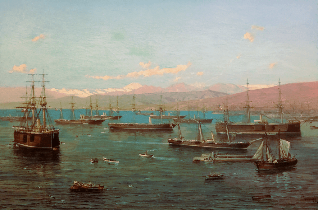 Au commencement de l’année 1879, la marine du Pérou était relativement formidable, et, d’après les documents officiels, elle était « la mieux organisée et la mieux disciplinée de celles de tous les Etats du Pacifique ». Cette marine se composait de quatre vaisseaux cuirassés : la frégate Independencia de 14 canons et les monitors Huascar, Atahualpa et Manco Capac, armés chacun de trois canons de gros calibre ; des corvettes en bois Union de 13 canons et Pilcomayo de six canons ; enfin de douze navires plus petits dont un était également cuirassé. L’armée comme la marine du Pérou étaient pénétrées du sentiment de leur immense supériorité en instruction militaire sur les forces de leurs voisins, et spécialement sur celles du Chili. La marine chilienne se composait de deux frégates cuirassées, la Blanco Encalada et l’Almirante Cochrane de six canons chacune ; de deux corvettes en bois O’Higgins et Chacabuco ; d’une canonnière en bois Magallanes et de quatre vaisseaux plus petits et peu propres à la guerre.
