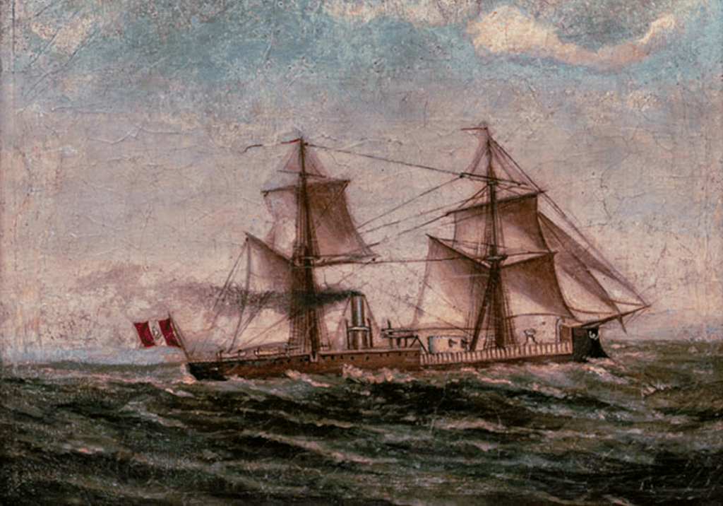 Dans ces mêmes jours, la frégate cuirassée Blanco Encalada, après avoir nettoyé sa coque à Valparaiso et avoir reçu quelques réparations, dans sa machine, reprit la mer pour se rendre sur le théâtre des opérations. D’après ses instructions, Riberos devait parcourir la côte du Pérou, au nord d’Arica, pour donner la chasse aux vaisseaux ennemis. Dans la matinée du 18 novembre, se trouvant un peu au nord de Mollendo, il aperçut vers le sud trois vaisseaux qui suivaient la même direction que lui. C’étaient les corvettes Union et Pilcomayo avec un bâtiment de transport. Plein de confiance dans la supériorité de sa frégate, l’amiral chilien se porta à leur rencontre. L’Union, suivie du bâtiment de transport, s’enfuit à toute vitesse en laissant seule le Pilcomayo. Celui-ci ne pouvait échapper à la poursuite du Blanco. Les marins péruviens comprenaient bien que toute résistance était impossible. A peine avait-on échangé quelques coups de canon qu’ils mirent le feu à l’arrière du vaisseau et, s’embarquant dans les chaloupes, ils arborèrent le drapeau blanc. L’amiral recueillit le commandant du Pilcomayo et les cent soixante-seize matelots et officiers. Il prit ensuite possession du vaisseau. L’incendie y avait éclaté, et activé par le vent du sud il devenait fort menaçant. L’amiral déploya alors une grande énergie. Malgré le danger, il plaça le Pilcomayo bord à bord du Blanco. A l’aide des puissantes pompes de ce dernier, il réussit à éteindre l’incendie. Bientôt, le Pilcomayo, convenablement réparé dans le bassin de Valparaiso, alla grossir le nombre des vaisseaux de l’escadre chilienne. Tels furent les premiers résultats de l’audacieuse campagne que le Chili venait de commencer.