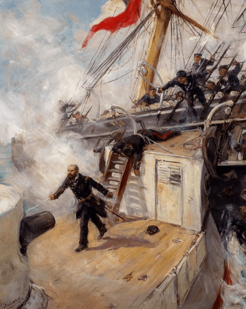 L’Esmeralda esquiva adroitement les deux premiers coups, en soutenant toujours de son feu de mousqueterie et d’artillerie, et au moment où le Huascar s’approchait pour la troisième fois, le vaillant commandant Prat, suivi d’un officier, le lieutenant Serrano, et d’un soldat, s’élança sur le pont du monitor péruvien en appelant les siens à l’abordage. Mais les navires s’étant de nouveau séparés, l’équipage chilien ne peut suivre son audacieux commandant. Prat et ses intrépides compagnons, après avoir commencé par renverser les ennemis qui se trouvaient sur leur passage, succombent sur le pont du Huascar sous les feux dirigés contre eux de l’intérieur de la tour.