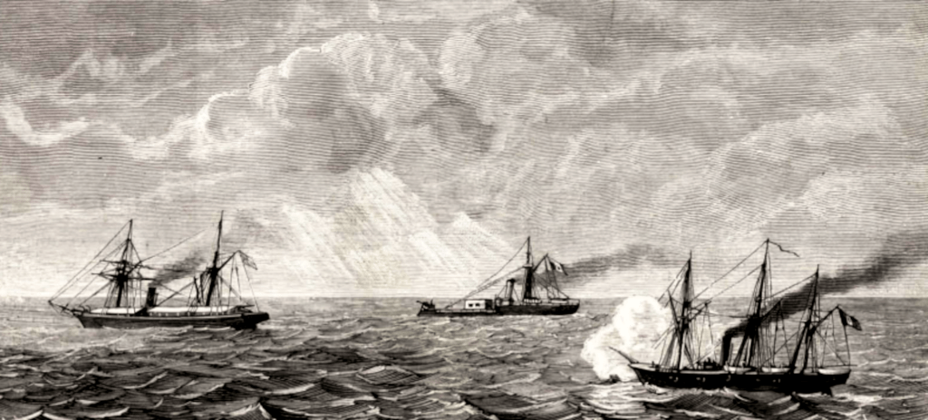 Le commandant Grau, élevé peu après au rang de contre-amiral, se prépara bravement à de nouvelles expéditions. Dans le même temps, la corvette péruvienne Union arrivait à Arica, et, comme la rapidité de sa marche la rendait très propre à une guerre de surprises, elle fut aussi placée sous les ordres du commandant Grau. Le 17 juillet, le Huascar et l’Union sortirent d’Arica et mirent le cap au Sud en s’éloignant de la côte pour éviter la rencontre de l’escadre chilienne. Ils se rapprochèrent de terre à la hauteur d’Antofagasta et s’emparèrent non loin de là de deux navires de commerce. Les vaisseaux péruviens longèrent ensuite la côte du sud, en détruisant toutes les chaloupes qu’ils trouvèrent dans les ports. Le 23 juillet, au lever du soleil, le Huascar et l’Union retournaient au nord lorsqu’ils aperçurent à quelques milles d’Antofagasta un vapeur qui semblait s’efforcer de gagner ce port. Il ne leur fut pas difficile de l’atteindre et de l’obliger à s’arrêter. C’était le navire marchand Rimac, que le gouvernement du Chili avait loué pour conduire ses troupes, et qui transportait alors un escadron de cavalerie de 258 hommes et un nombre inférieur de chevaux. Le transport tomba au pouvoir des vaisseaux péruviens et son équipage fut conduit prisonnier à Arica.