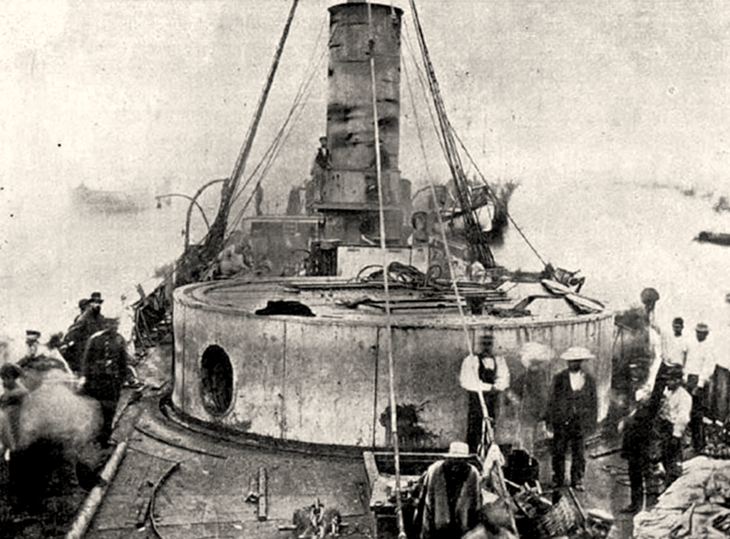 Pendant ce temps le Blanco avançait à toute vapeur vers le théâtre du combat, et ouvrant le feu contre le monitor péruvien, s’élançait à son tour sur lui pour le percer. La lutte était de plus en plus acharnée, et l’épaisse fumée des canons, des mitrailleuses et des fusils, cachait par moment la vraie position de chacun des navires. Le commandant Latorre, par une manœuvre hardie plaça enfin le Huascar entre deux feux, et le monitor dut se rendre à onze heures moins cinq minutes. Le combat avait duré une heure et demie. Plusieurs marins du Huascar, croyant sans doute que les vaisseaux chiliens voulaient les ensevelir sous les eaux, se jetèrent à la mer dans le plus grand désordre. Les Chiliens n’avaient nullement l’intention de commettre une faute aussi énorme. Le Huascar, quoique endommagé et percé en plusieurs endroits, était une proie trop importante pour qu’on ne cherchât point à s’en emparer. Le commandant Riberos envoya ses chaloupes pour recueillir les naufragés et prendre possession du navire ennemi. Il restait vingt-huit chefs ou officiers vivants, et plus de cent individus de toutes nationalités qui faisaient partie de l’équipage. Ils furent tous faits prisonniers. Les Péruviens avaient ouvert les soupapes du monitor pour le couler, et l’eau entraient en grande quantité dans la cale. Les vainqueurs les fermèrent au plus vite et parvinrent ainsi à sauver leur conquête.