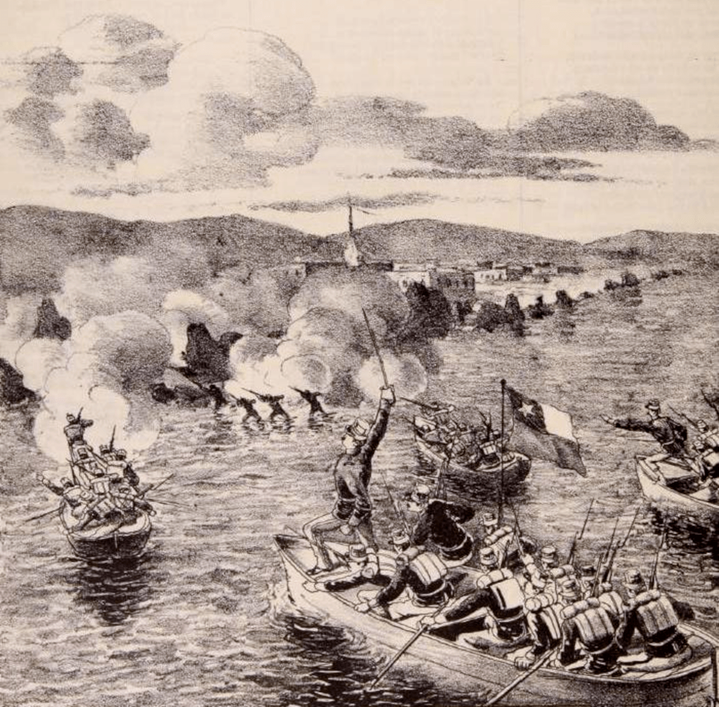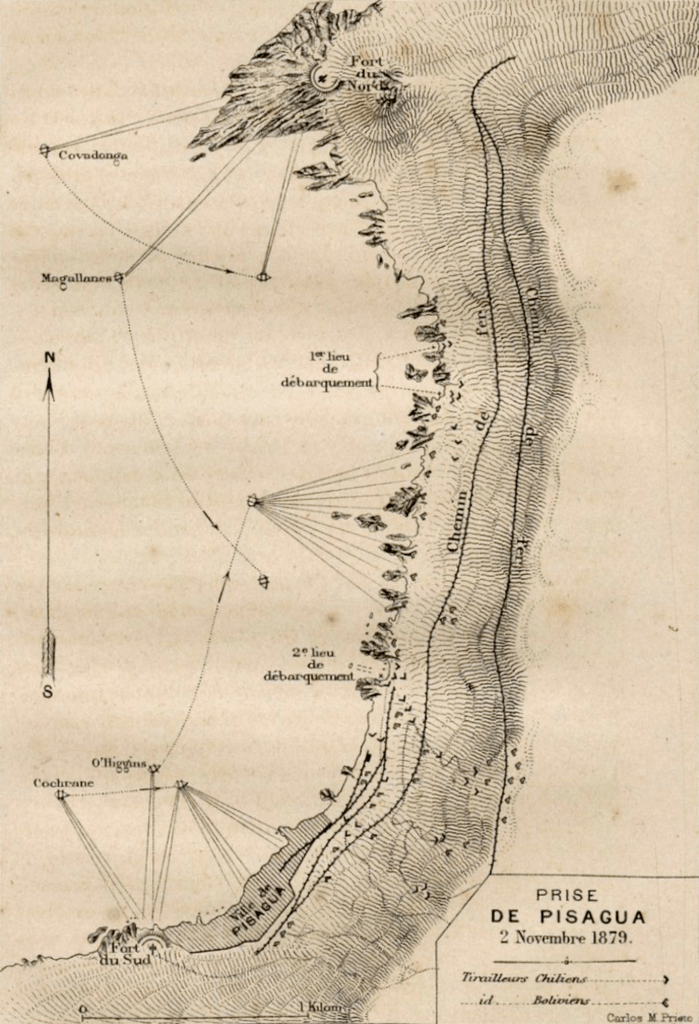Les marins chiliens étaient pourvus des meilleures cartes hydrographiques, et ils portaient sur eux une description du pays dans laquelle se trouvaient consigné avec un soin scrupuleux tous les renseignements qui pouvaient être de quelque utilité. Mais ils devaient consulter moins la facilité du débarquement que l’importance stratégique du point où il s’effectuerait. On avait désigné le port de Pisagua, d’un accès difficile mais qui avait le précieux avantage de leur permettre de couper en deux les forces de la coalition, massées les unes à Iquique et les autres à Arica. L’escadre chilienne se présenta devant la baie de Pisagua le 2 novembre au point du jour. Les quatre vaisseaux de guerre ouvrirent le feu contre les batteries de terre à sept heures du matin, et ils le firent avec tant de succès qu’en moins d’une heure les artilleurs péruviens suspendirent le feu et abandonnèrent leurs canons. On détacha alors des transports chiliens dix-sept chaloupes qui conduisirent 450 hommes sus les ordres du commandant don Ricardo Santa Crux. Malgré l’intensité du feu de mousqueterie dirigé contre eux de tous les rochers voisins, le détachement gagna la plage, hissa le drapeau chilien sur une éminence. Une autre colonne chilienne essayait de débarquer dans un autre endroit très rapproché du village. L’ennemi dirigeait sur les bateaux des assaillants un feu très nourri. Les artilleurs péruviens, revenus de leur terreur et se croyant sûrs de repousser le débarquement, retournèrent à leurs batteries et commencèrent le feu. A ce moment la défaite des Chiliens paraissait d’autant plus inévitable que la première colonne avait épuisé ses munitions.