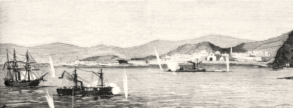 Ce fait, qui fut célébré au Pérou comme une victoire, activa les opérations de l’escadre chilienne, jalouse d’empêcher tout mouvement des navires ennemis. En effet, sans lever le blocus d’Arica, de Mollendo et des côtes adjacentes, la frégate cuirassée Blanco Encalada, le monitor Huascar, la corvette O’Higgins, deux croiseurs et d’autres petits navires allèrent, le 10 avril, bloquer le Callao et les ports voisins. Après le délai accordé aux navires marchands qui portaient le pavillon neutre, on commença le bombardement des forts de la place et des navires péruviens réfugiés dans l’arrière-port. Cette opération, qui allait causer le plus grand préjudice au commerce du Pérou, en fermant ses principaux ports, venait mettre fin à toutes les excursions que les vaisseaux de ce pays pouvaient faire sur les côtes voisines du Callao. A partir de ce jour, les navires chiliens parcoururent la mer dans toutes les directions sans essuyer aucune surprise.