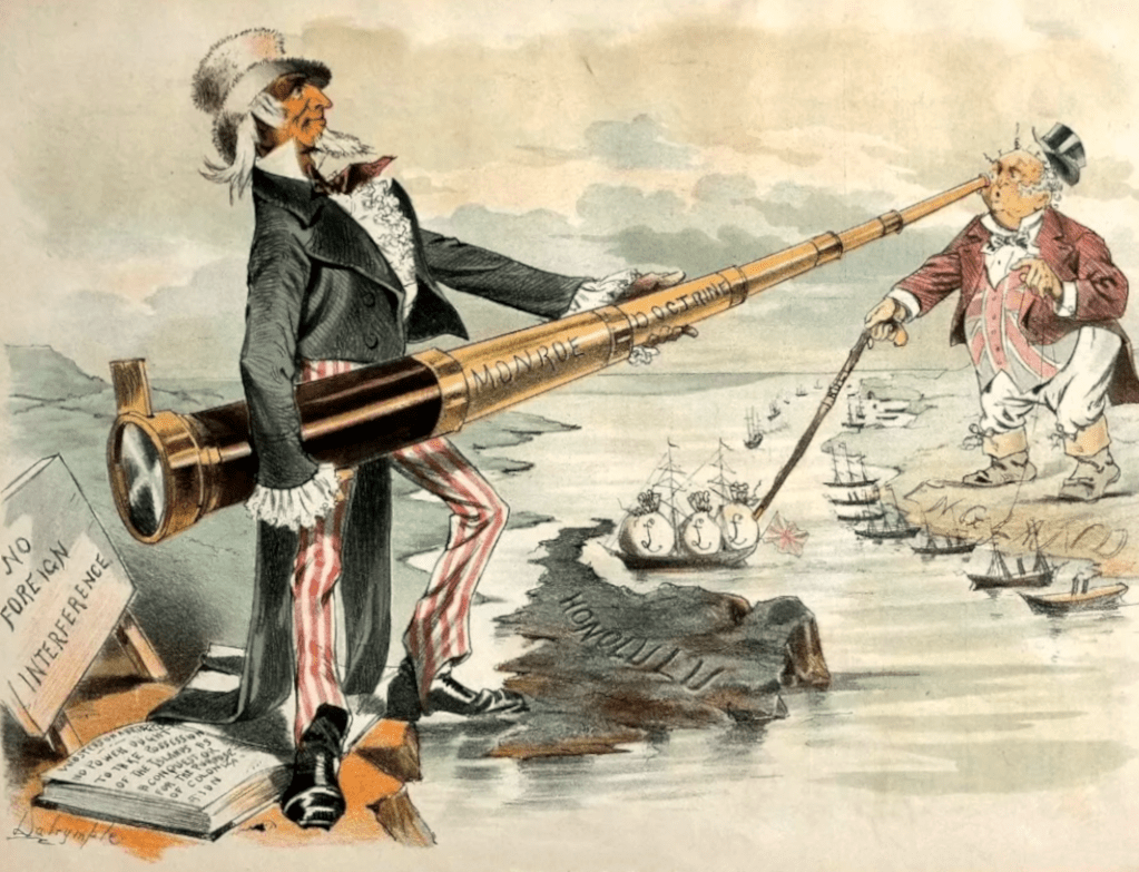James Monroe affirmait par la même occasion que les Etats-Unis entendaient s’opposer, par la force si nécessaires, à de futures ingérences européennes sur le sol américain : « Par conséquent, par souci de franchise et compte tenu des relations amicales qui unissent les Etats-Unis à ces puissances, nous devons déclarer que toute tentative de leur part d’étendre leur système à une quelconque partie de cet hémisphère serait une menace pour notre paix et notre sécurité. Nous ne sommes pas intervenus et n’interviendrons pas dans les colonies ou dépendances existantes des puissances européennes. Mais vis-à-vis des gouvernements qui ont proclamé et maintenu leur indépendance, et dont nous avons reconnu l’indépendance après mûre réflexion et en nous fondant sur des principes justes, nous ne saurions interpréter toute intervention d’une puissance européenne visant à les opprimer ou à contrôler leur destin de quelque manière que ce soit, autrement que comme la manifestation d’une hostilité envers les Etats-Unis ».