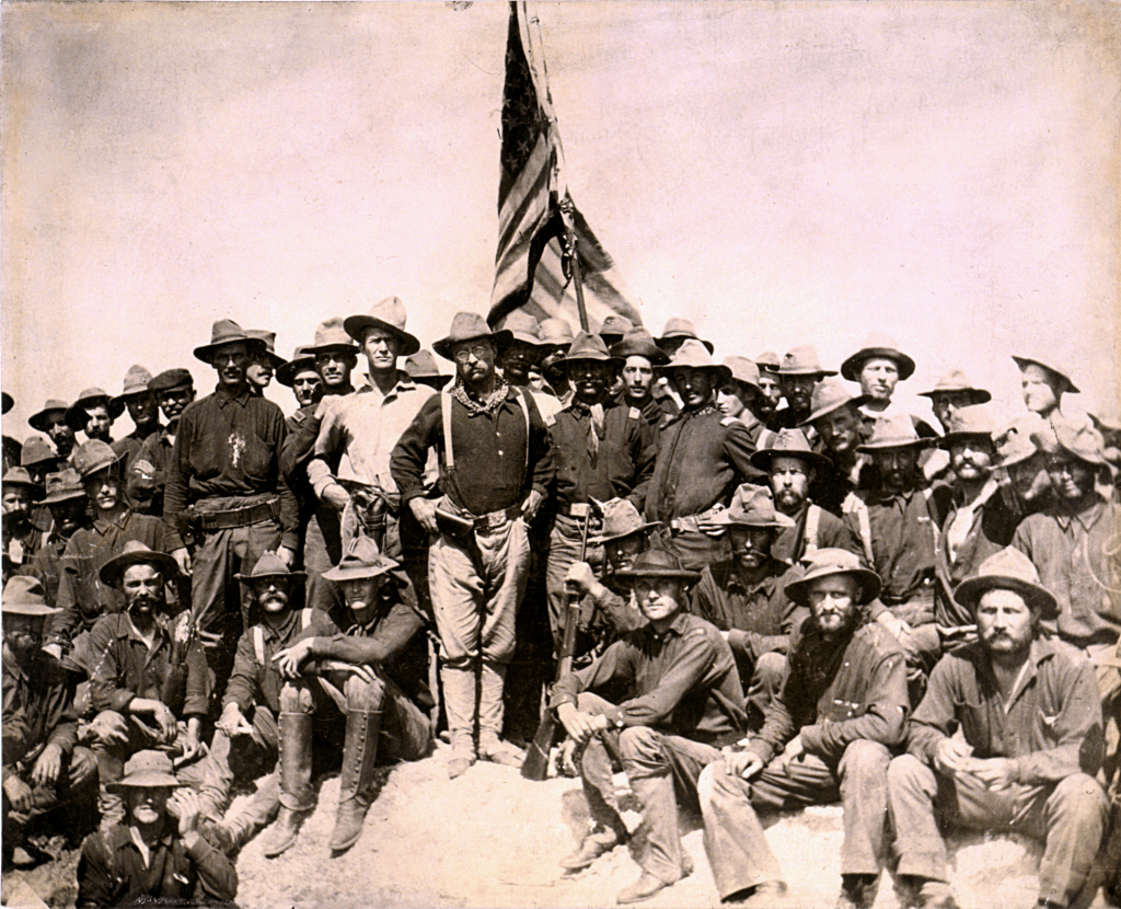 Désireux de s’engager personnellement dans cette guerre hispano-américaine, Theodore Roosevelt démissionna le 10 mai 1898 de son poste de secrétaire d’Etat à la Marine, et participa à la mise sur pieds du 1st United States Volunteer Cavalry regiment, commandé par le Colonel Leonard Wood (1860-1927). Au départ de ce dernier, Theodore Roosevelt prit le commandement du régiment, bientôt connu sous le surnom de « Rough Riders » (que l’on pourrait traduire par les « cavaliers durs à cuire »). Curieuse aventure que celle d’un régiment de volontaires conduits par un ancien secrétaire d’Etat à la Marine ! Les Rough Riders s’illustrèrent à Las Guasimas le 24 juin 1898, et à San Juan le 1er juillet. Ces succès renforcèrent la popularité de Theodore Roosevelt, qui fut élu gouverneur de l’Etat de New York l’année suivante.
