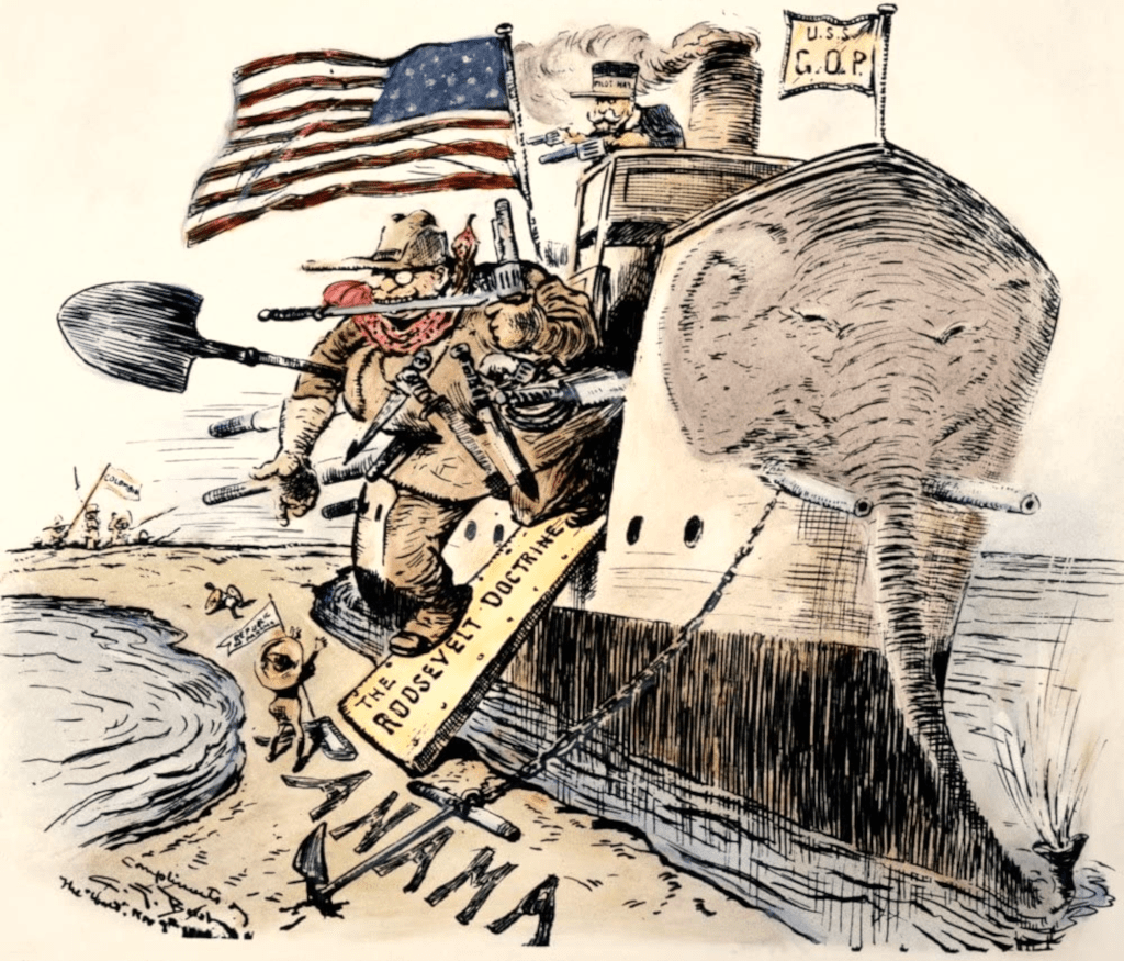 Une série de crises secouant les Etats riverains de la mer des Caraïbes allait donner à Theodore Roosevelt l’occasion d’intervenir dans les affaires de l’Amérique centrale, puis de réaffirmer les fondements de la doctrine Monroe. Depuis le mois d’octobre 1899, une guerre civile déchirait la Colombie, dont dépendait alors la région de Panama où les travaux sur le canal avaient été interrompus dix ans plus tôt. Encouragés par une première victoire à la bataille de Peralonso au mois de décembre, les insurgés du Parti libéral colombien lancèrent une offensive au Panama, qui se solda par une retraite mais laissa peser une menace sur cette région stratégique.