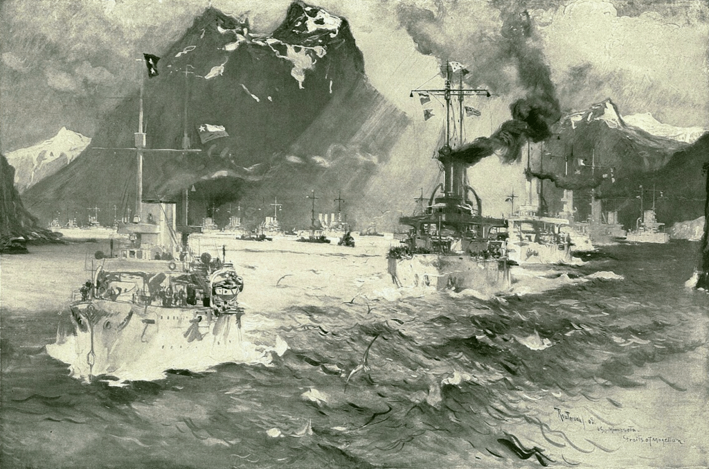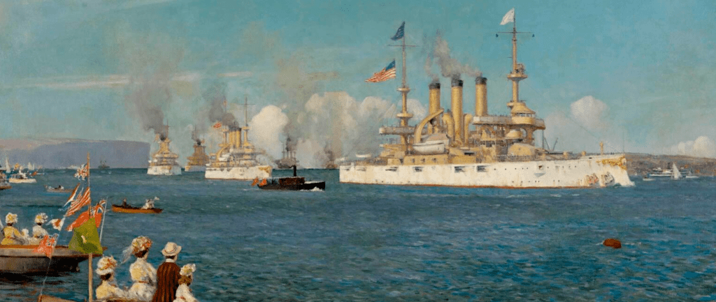 Le 16 décembre 1907, seize cuirassés défilèrent à Hampton Roads devant le président Theodore Roosevelt, qui avait pris place à bord du yacht USS Mayflower. Cette impressionnante revue navale marquait le début d’un circumnavigation de 14 mois. La « Great White Fleet », surnom que l’on devait à la livrée blanche que les cuirassés de l’US Navy arboraient en temps de paix à cette époque, était organisée en deux escadres et quatre divisions, qui parcoururent ensemble l’essentiel des 40 000 nautiques parcourus, ponctués de 20 escales sur six continents. Une flotte de destroyers accompagna la flotte sur la première étape de son voyage d’Hampton Roads à San Francisco via le détroit de Magellan. Les cuirassés et navires de soutien poursuivirent seuls le reste de leur parcours les conduisant à Hawaï, en Nouvelle-Zélande et en Australie puis en Asie du sud-est, dans l’océan Indien via le détroit de Malacca puis en Europe via le canal de Suez, avant la traversée de l’Atlantique pour un retour aux Etats-Unis au début de l’année 1909.