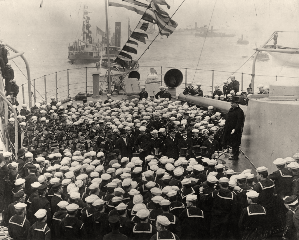 Quatorze mille marins américains prirent part à cette extraordinaire démonstration de puissance, qui renforçait significativement l’expérience des équipages de l’US Navy. Ce déploiement signifiait également à l’Empire du Japon, vainqueur de Tsushima deux ans plus tôt, que l’US Navy pouvait désormais se projeter et défendre ses intérêts loin de ses bases. La « Great White Fleet » eut également l’occasion de se distinguer en apportant son soutien à la population de Messine, touchée par un violent séisme le 28 décembre 1908. Theodore Roosevelt passa de nouveau en revue la flotte à son retour triomphal à Hampton Roads le 22 février 1909.