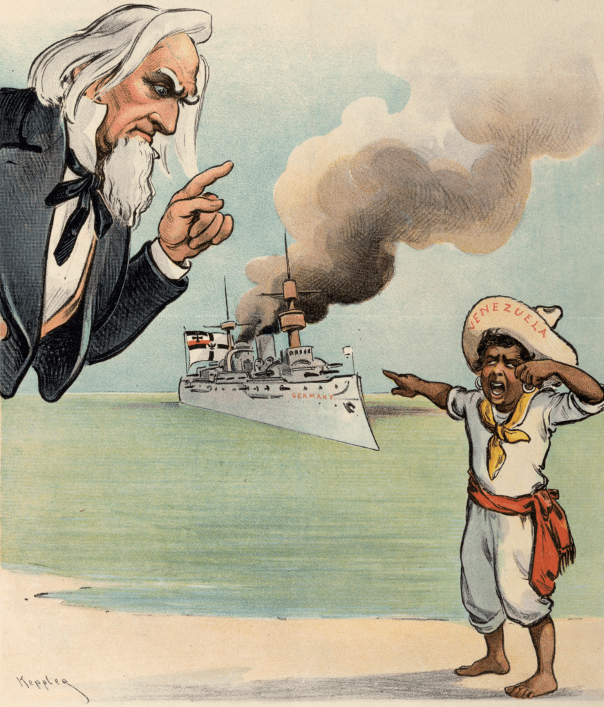Le Venezuela se voyait quant à lui opposé aux puissances européennes. Le président Cipriano Castro contestait la mainmise britannique et allemande sur les ports et le commerce du pays, et mit un terme en 1901 au paiement de dettes contractées au bénéfice des deux puissances, entraînant une réaction de ces dernières. Le Royaume-Uni et l’Allemagne imposèrent en décembre 1902 un blocus des ports vénézuéliens, assurant aux Etats-Unis que leur objectif se limitait au paiement des dettes vénézuéliennes. S’en tenant à une interprétation stricte de la doctrine Monroe, les Etats-Unis ne prévoyaient en effet d’intervenir qu’en cas de prise de contrôle effectif d’un territoire. Avant son accession à la présidence, Theodore Roosevelt avait ainsi affirmé que les puissances européennes pouvaient intervenir en vue du recouvrement de créances : « si un pays d’Amérique du Sud se comporte mal envers un pays européen, que ce dernier le corrige ».