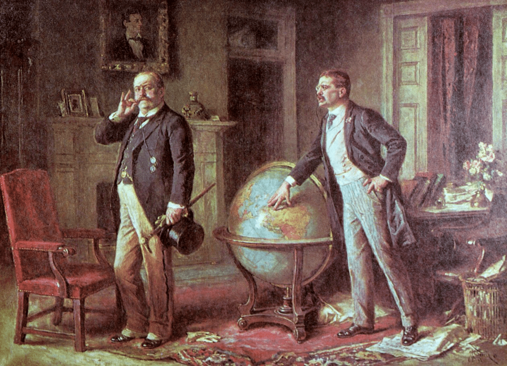 Les concepts de Mahan influencèrent notamment le nouveau secrétaire d’Etat à la Marine, Théodore Roosevelt, nommé le 19 avril 1897. L’intérêt de Roosevelt pour la Marine n’était pas nouveau : élu à l’assemblée de l’Etat de New York en 1882, il avait publié l’ouvrage La guerre navale de 1812. A son arrivée au gouvernement, la question cubaine était au cœur des réflexions de l’appareil d’Etat américain. Les Etats-Unis, voyant d’un mauvais œil la présence espagnole à leurs portes, soutenaient financièrement l’insurrection cubaine dès 1895. A la fin de l’année 1897, le nouveau secrétaire d’Etat à la Marine exposa sans détour son opinion au sujet de l’insurrection agitant l’île de Cuba depuis deux années : « Je considérerais une guerre contre l’Espagne selon deux points de vue. Premièrement, une opportunité d’interférer d’un point de vue humanitaire et en fonction de nos intérêts personnels dans la région en faveur des Cubains, et de faire un pas de plus vers la fin de la présence européenne en Amérique ».