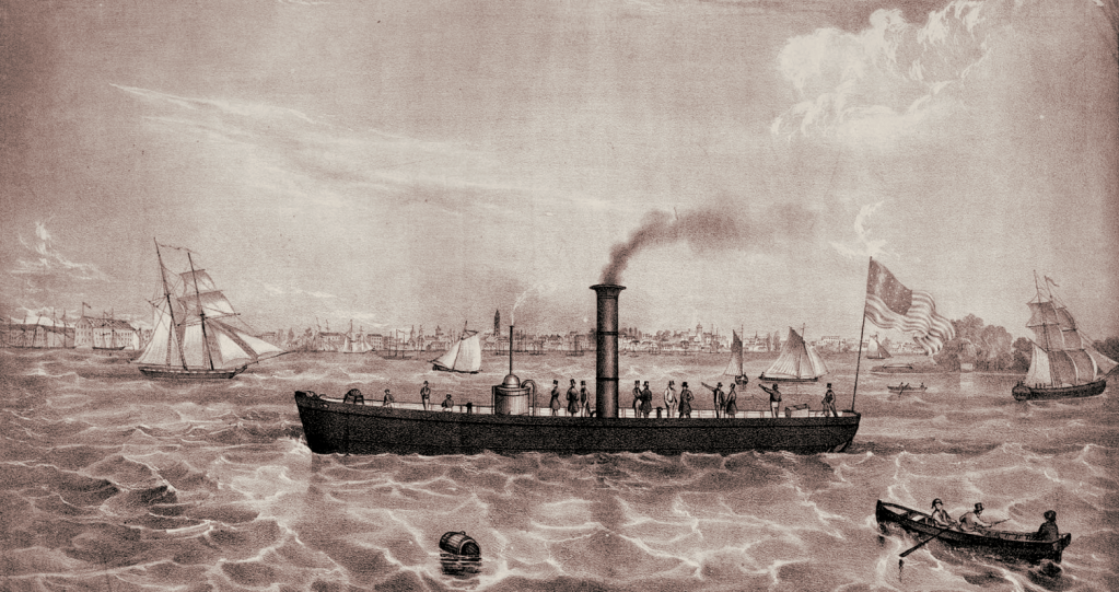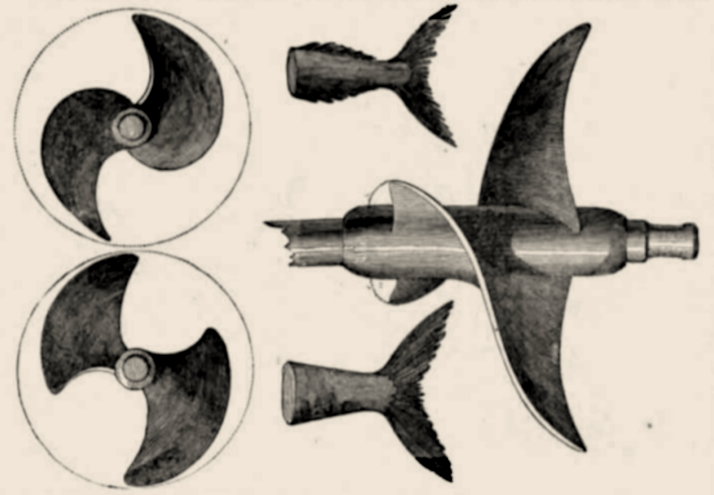 On ne compte pas moins de 100 personnes qui aient cherché, la plupart fort récemment à la vérité, à donner aux bâtiments à vapeur un mode de propulsion mécanique par l’arrière, ou à perfectionner le mode de propulsion : tous les systèmes mis en avant, et plus ou moins imités de l’autre, ont pris leur source, soit dans le jeu propulsif de la queue du poisson, ou de la rame-godille, qui en a été l’imitation primitive, soit dans la puissance relative de la vis d’Archimède, sois même dans celle du moulin à vent.