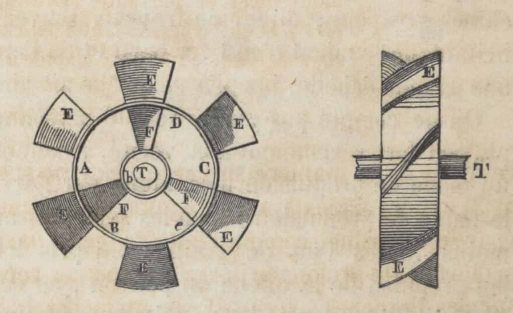 Ce fut en 1823, alors que la navigation à vapeur ne commençait à révéler ses progrès qu’aux hommes les plus clairvoyants, que le capitaine français Delisle adressa au ministre de la Marine un mémoire relatif à l’application de la vis d’Archimède comme agent propulsif des navires à vapeur. M. Delisle proposait de construire cette vis de la manière suivante : sur un arbre (T) étaient fixés à angles égaux trois branches (F), en tôle très épaisse et tordue, comme l’eût été cette partie de la vis elle-même, si elle eût été prolongée jusqu’à l’axe ; un cercle (A, B, C, D) boulonné sur ces branches, recevait six segments hélicoïdes (E), formant ensemble presque un tour entier de la vis. Il ne fut pas donné suite au mémoire du capitaine Delisle, et aujourd’hui cependant, l’on peut apprécier avec quelle sagacité et quelle exactitude étaient établis les calculs de cet officier.