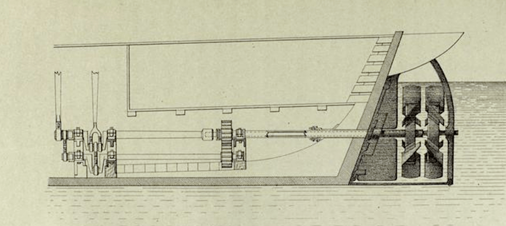 Quant à la vis d’Archimède, dont l’usage est familier à tous, comme vis à bois par exemple, on sait qu’appliquée à l’arrière d’un navire, elle tire son pouvoir propulsif des filets ou lames fixées sur un axe parallèle à la quille du navire ; ces filets forment des segments d’hélice ou de spirale, de sorte qu’en faisant tourner l’axe, les filets se fraient un chemin dans l’eau, comme la vis dans une pièce de bois. Il y a naturellement cette différence entre la vis à bois et la vis de propulsions sous-marine, que cette dernière agissant, non sur un corps solide, mais sur un corps fluide, ne peut pousser le navire sans déplacer l’eau, ce qui équivaut à une perte de force. Nous allons choisir, parmi les noms qui se rattachent à cette application, ceux qui figurent en première ligne et ont tracé la voie à tous les autres.
