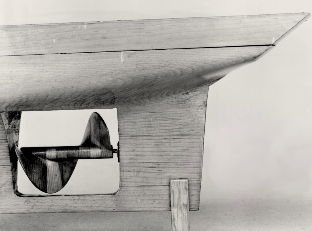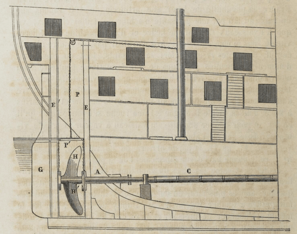 « Il résulte des recherches que nous avons faites pour placer machines et chaudières à l’abri du boulet, qu’en adoptant pour les vaisseaux une machine de la force de 1 000 chevaux, même à basse pression, tout le système peut être placé entièrement au-dessous de l’eau, ou de la flottaison ; la vis est complètement immergée et protégée par l’arrière du navire qui la recouvre. Reste maintenant à examiner les inconvénients principaux qui peuvent résulter de l’application de la vis aux vaisseaux de ligne. La vis, même désembrayée, nuit au sillage, dit-on, puisque d’après les expériences du capitaine Ericsson, elle le diminue d’1/25e ; cet inconvénient pourrait disparaître au moyen de la disposition que nous avons mentionnée ; celle d’un puits ».