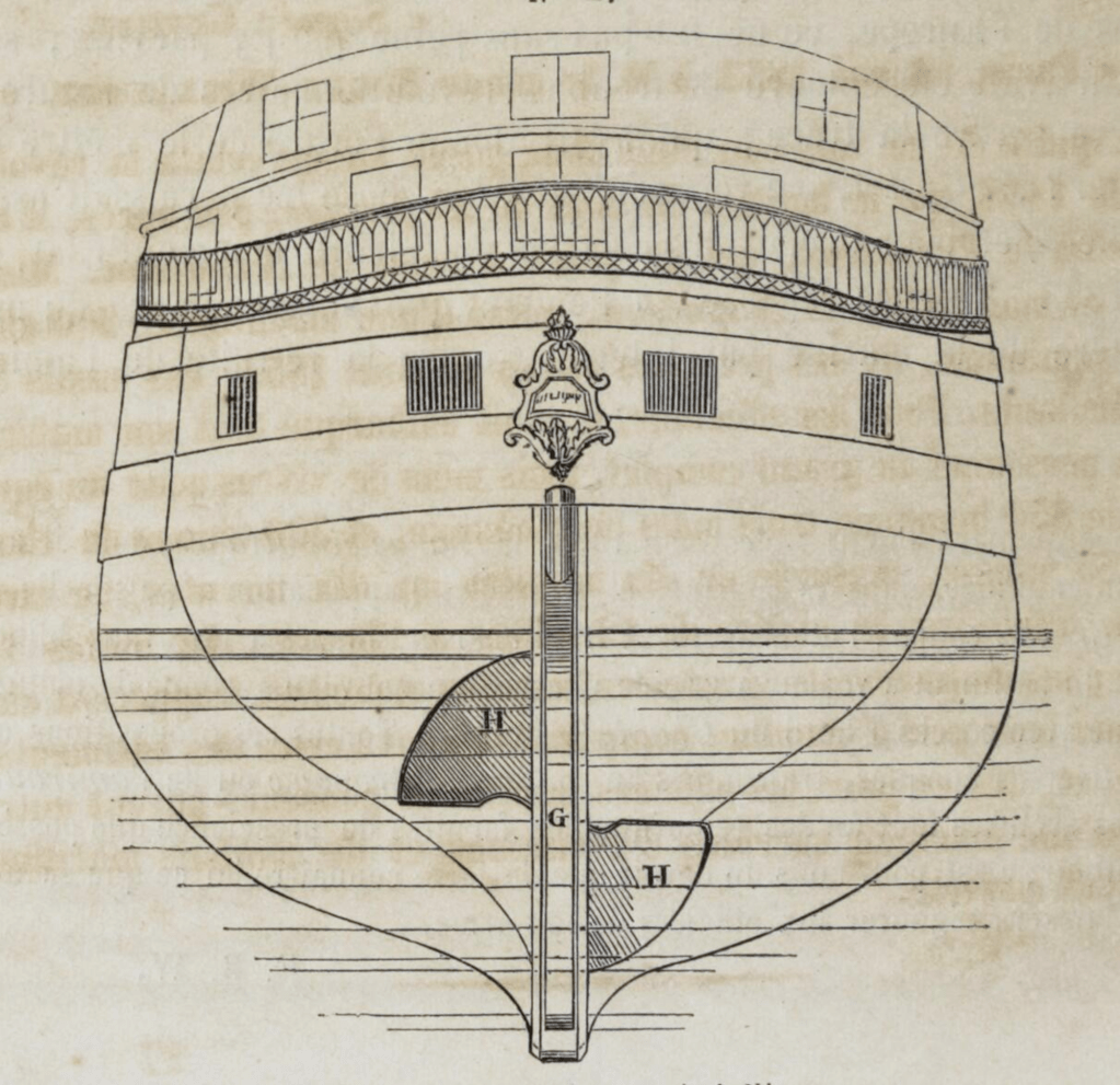 Les propositions du capitaine Labrousse firent grande sensation dans le monde marin, mais beaucoup plus d’incrédules que d’adeptes ; on nia, et peut-être plus encore en Angleterre qu’en France, la possibilité de loger une artillerie de 100 canons sur un vaisseau mû par une puissante machine de 1 000 chevaux, vu que les vaisseaux dotés d’une hélice et d’une machine à médiocre vitesse sous le nom de Guard’ship n’avaient pas, de l’autre côté du détroit, donné des résultats forts satisfaisants, tout en présentant d’immenses difficultés pratiques de transformation : peut-être aussi nos voisins, sans s’en rendre bien compte, éprouvaient-ils une certaine répugnance à doter les plus puissantes machines de guerre d’un moteur obéissant qui rendait inutiles et la marine et les marins à voiles, dont la vieille Bretagne est une ruche si féconde ; quoi qu’il en fût, et pour donner une idée du vaisseau à vapeur à grande vitesse proposé par M. Labrousse, nous reproduisons, vue par le travers, la partie arrière de ce vaisseau, et cette même partie vue directement de la poupe.