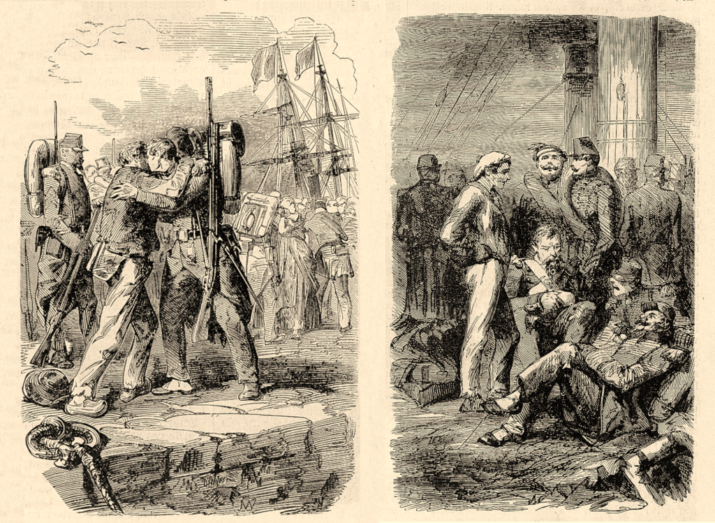 Passons au départ. Il y a là dans le port deux bâtiments à vapeur, une vaillante frégate de l’Etat et un de ces riches et rapides steamers des messageries impériales. Tous deux chauffent vigoureusement, tandis que de nombreuses embarcations leurs amènent les derniers détachements. A bord le brouhaha est étourdissant. Le pont est déjà encombré par les stalles des chevaux, les fourrages, le charbon supplémentaire, les approvisionnements de la guerre, et surtout par le bagage en désordre des arrivants. On se demande comment tout cela prendra place de façon à permettre les manœuvres, comment même les passagers arriveront à vivre pendant la traversée. Cependant les embarcations accostent toujours, et les hommes montent incessamment à tribord et à bâbord. L’un poussant l’autre, chacun cherche, et mieux encore trouve un petit coin dont la prise de possession est marquée par le dépôt du sac, du bidon et de la couverture.