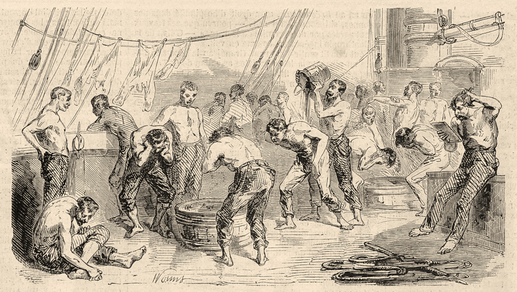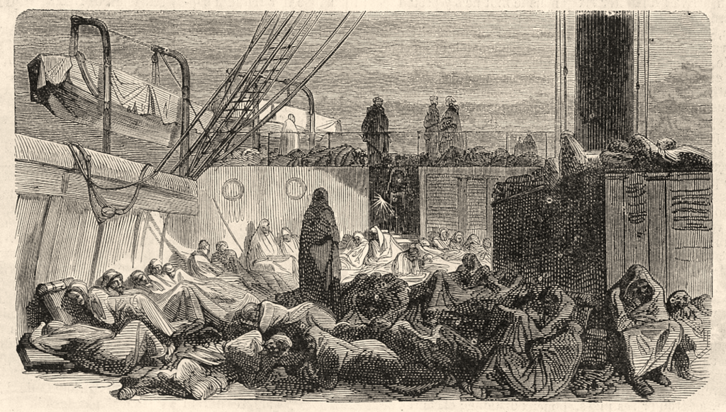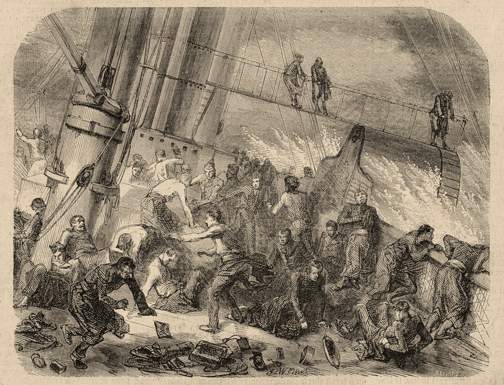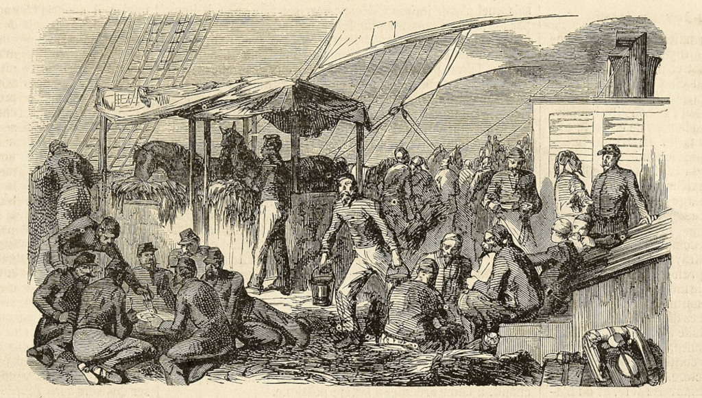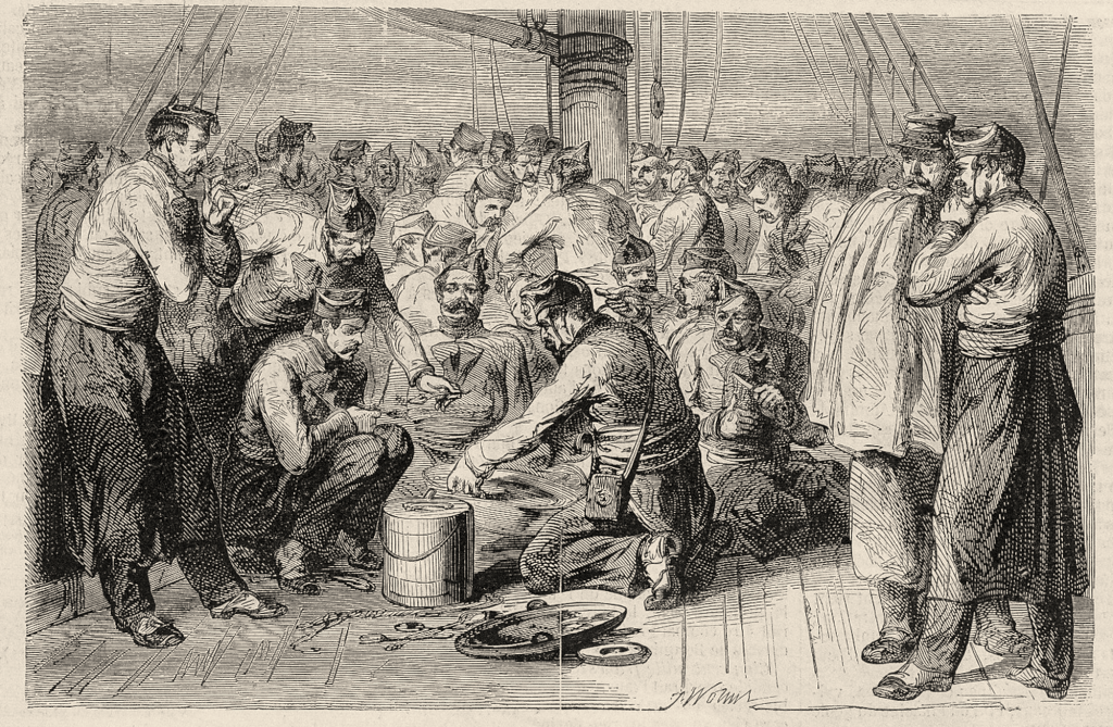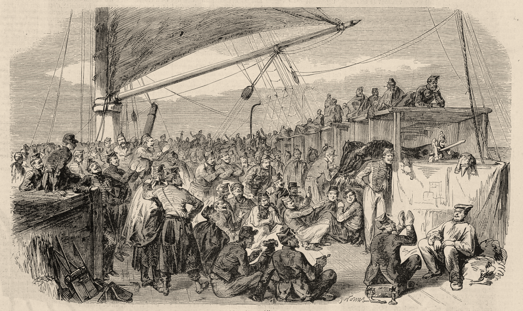 L’ordre, avons-nous dit, règne à bord : soit ; mais c’est un peu comme à Varsovie ; cela ne veut pas dire que tout le monde s’y trouve dans les conditions de bien-être désirables. Rien, au contraire, n’est plus pénible pour le troupier que cette traversée de quelques jours. Si ce voyage est à peu près supportable à bord des bâtiments à batteries où les entreponts offrent au moins un asile aux passagers, il n’en est certes pas de même sur les corvettes à vapeur ou à voiles, et surtout dans les transports nolisés par l’Etat. Dans les premiers, les hommes sont entassés, mais ils sont couverts ; sur les corvettes et sur les transports, le jour, la nuit, qu’il fasse froid, qu’il fasse chaud, qu’il pleuve même, le soldat n’a d’autre refuge que le pont, d’autre habitation que sa couverture.
