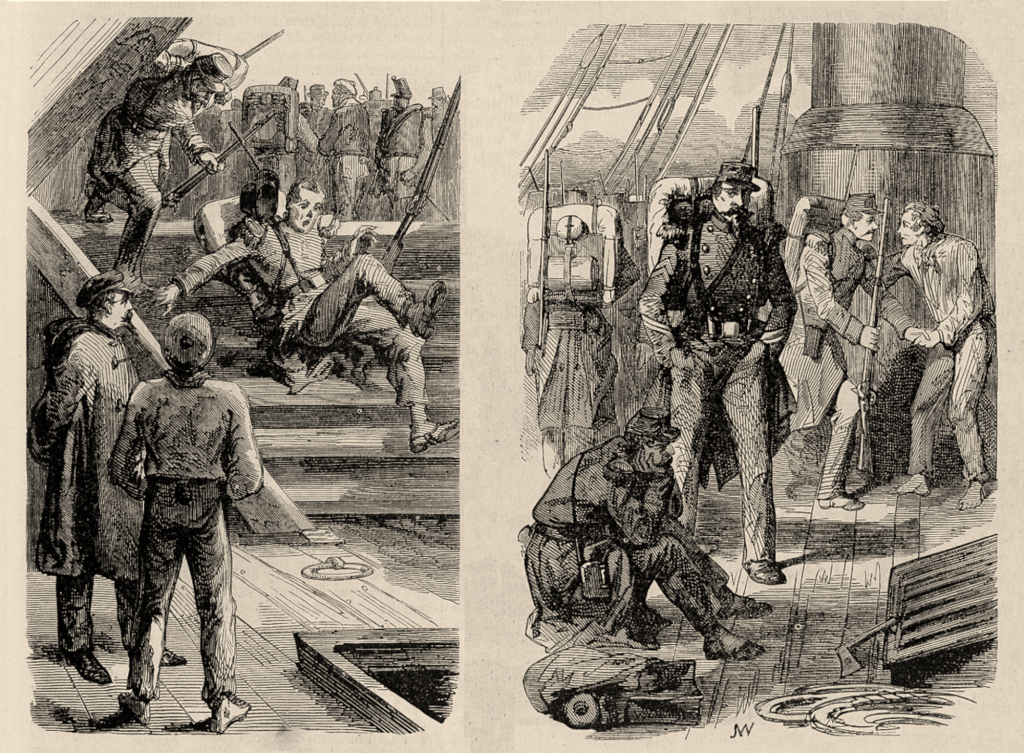 Je n’ai pas besoin de faire remarquer, dans cet embarquement, manœuvre naturellement de peu d’usage à l’armée de terre, toutes les maladresses du jeune soldat. Il arrive plus d’une fois que, tandis qu’on le hisse à bord, les pieds et les mains lui manquent en même temps, et alors les marins, en riant, le rattrapent au vol. Lui, son fusil, son sac, sa couverture, et tout l’attirail est jeté d’un bloc sur le pont. Le pauvre diable se relève, choppant à droite, s’accrochant à gauche, manque de tomber dans la machine, puis disparaît par l’escalier du grand panneau ; on le retrouve tout contusionné dans la batterie. Enfin ce sont, multipliés à l’infini, tous les accidents invariables, mais éternellement grotesques, des marins qui débutent.